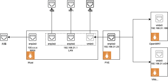 实际上,我们可以只安装 OpenWRT 作为我们的软路由系统,但我总感觉 OpenWRT 更新的太快,有的时候不是很稳定,还是将这两者分开更加好一些,至少在 OpenWRT 不稳定的时候不至于影响互联网的访问。