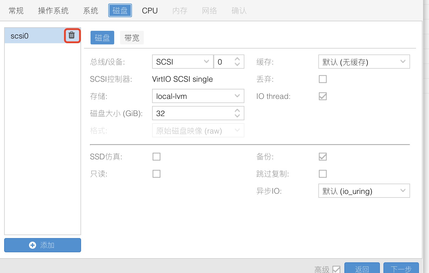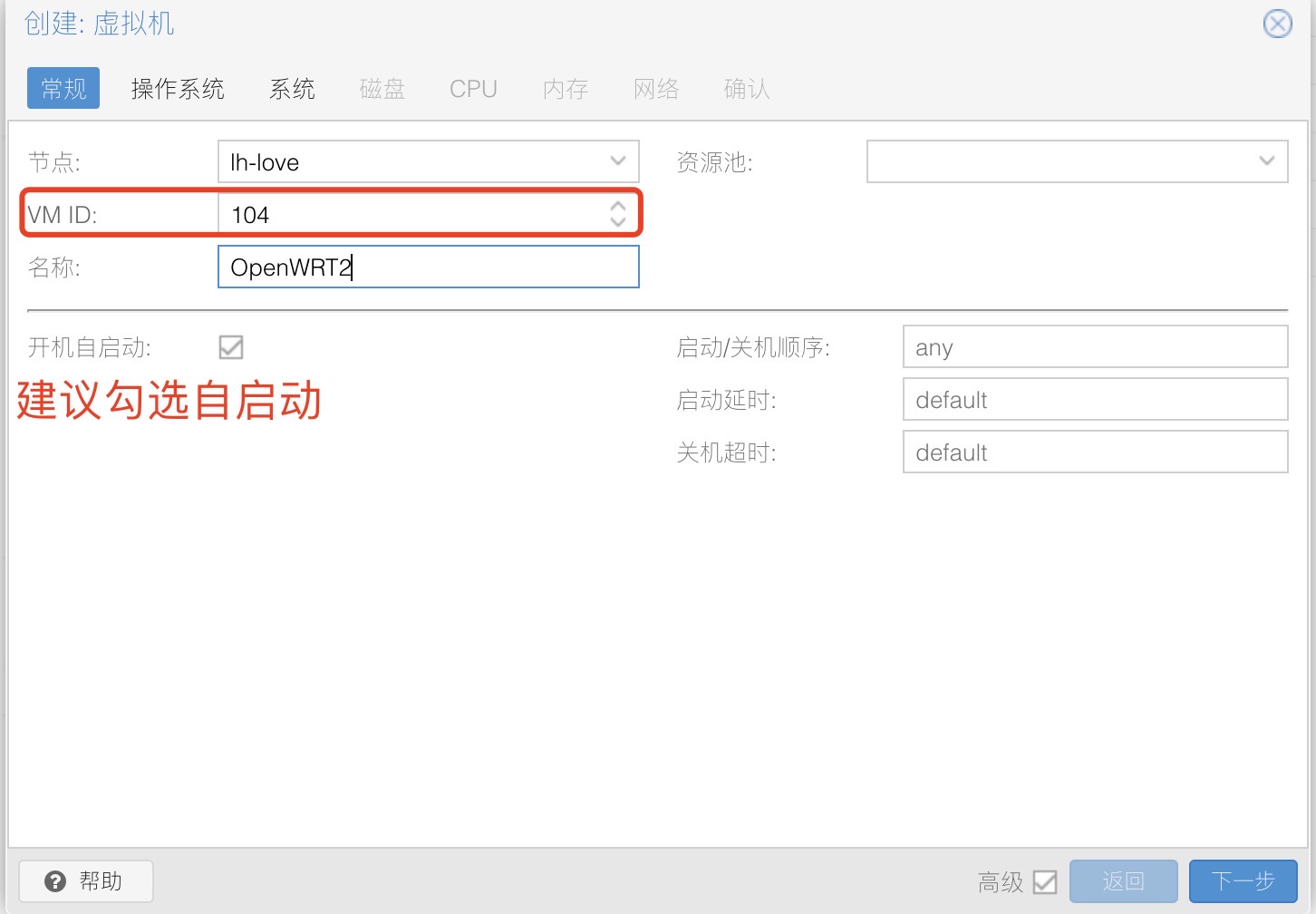 在创建虚拟机时,需要记住 VM ID,后面需要用到,下一步