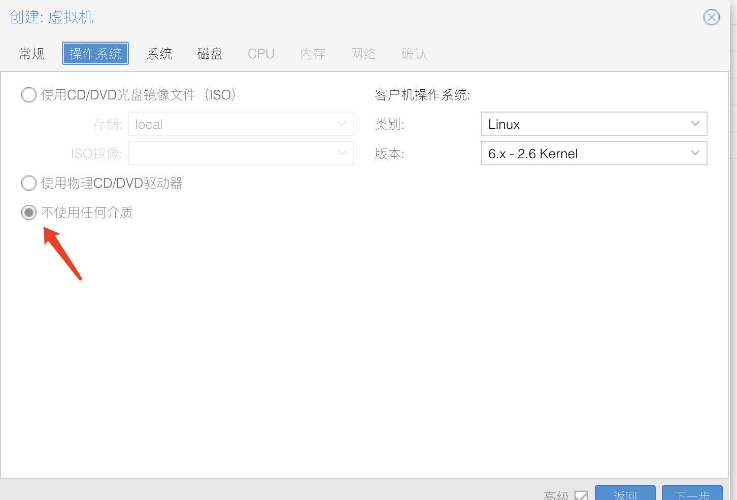 在操作系统选项卡中,先选择不使用任何介质,kernel 选择 5.x 或者 6.x,下一步