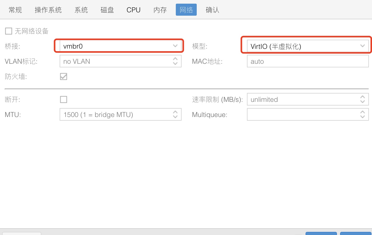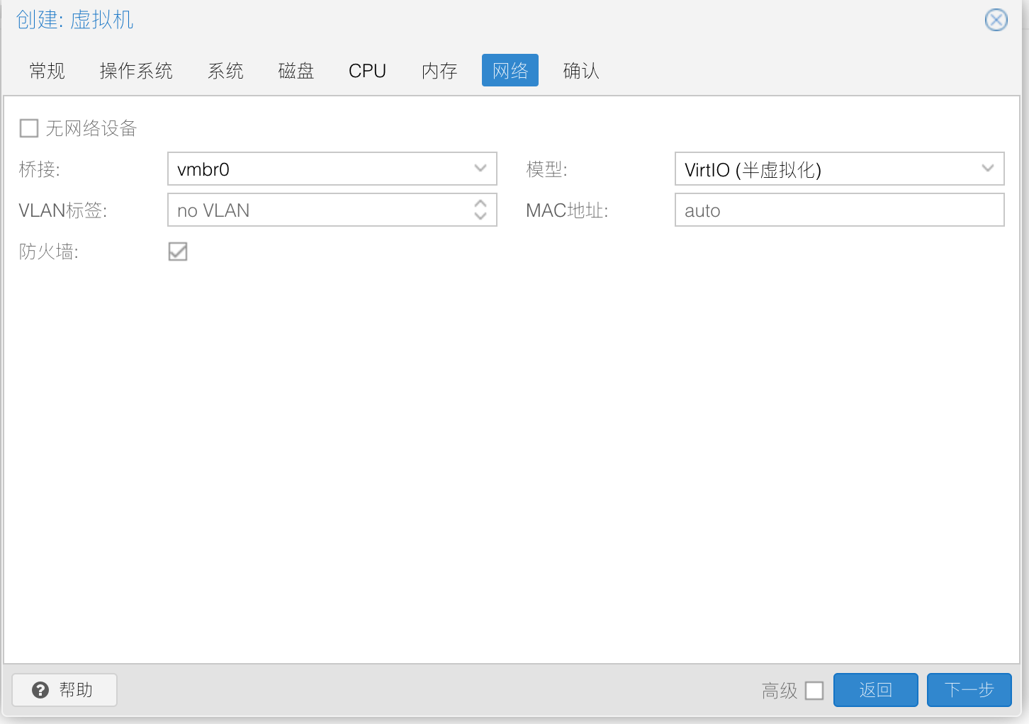 网络默认走桥接,看下配置是否和下图一致,下一步,完成创建。