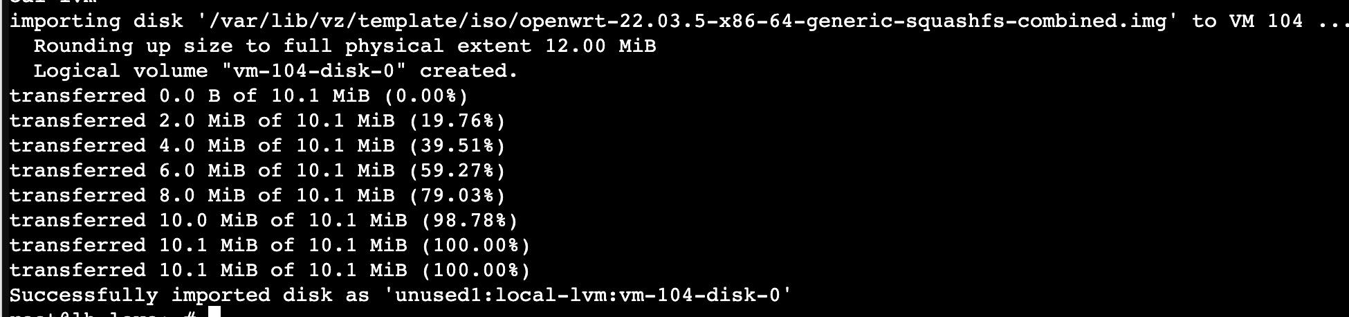 qm importdisk ${VM_ID} /var/lib/vz/template/iso/${OPENWRT_IMG} local-lvm