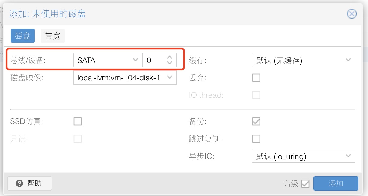 我们需要将这块硬盘启用。双击这块硬盘,将总线/设备改为 SATA 后添加