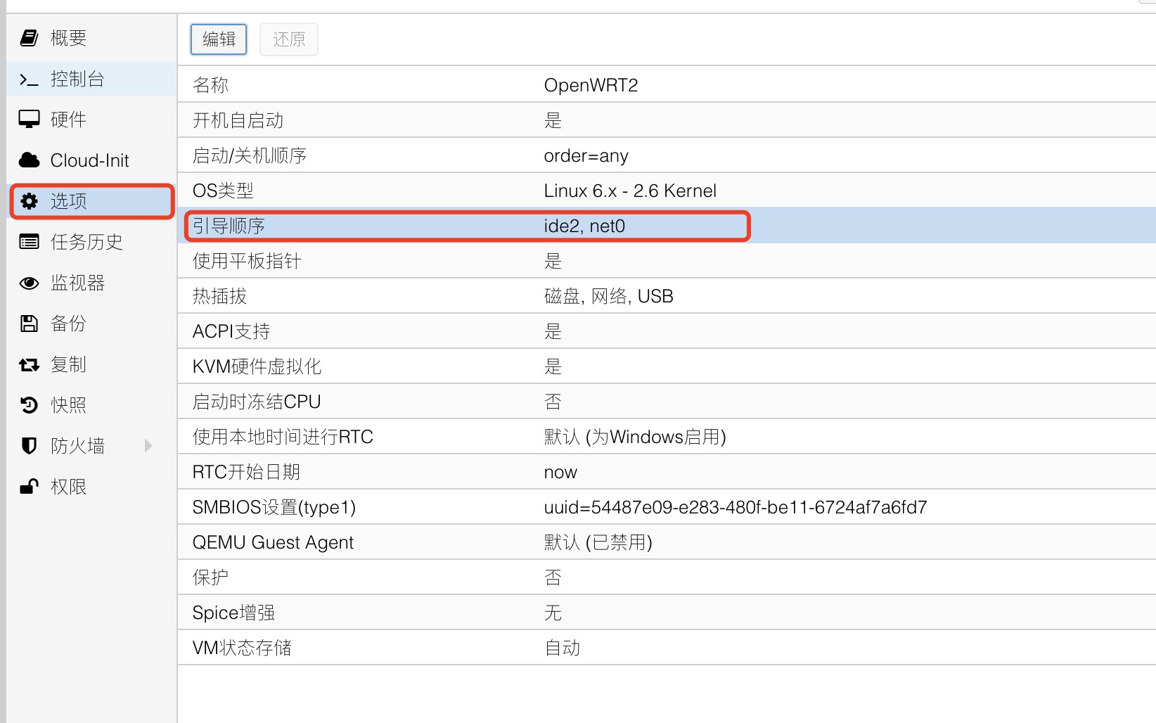 其中,${VM_ID} 代表刚才创建的虚拟机的 ID,${OPENWRT_IMG} 表示上传的镜像的名称。