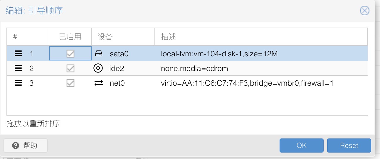 随后,打开虚拟机选线中的引导顺序一栏,将这块硬盘的引导顺序改成第一。