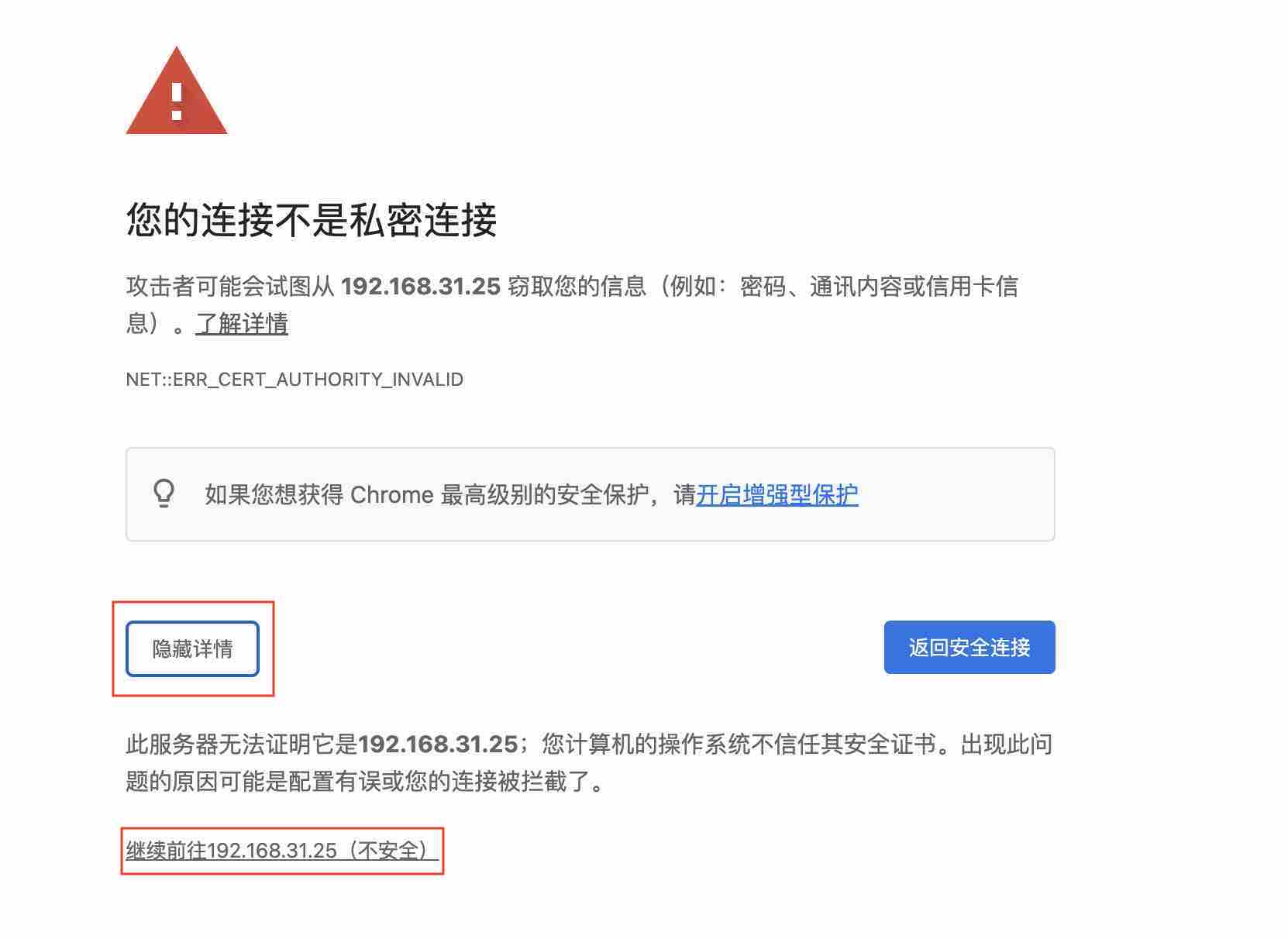 如果此时浏览器提示链接不安全记得点击继续前往