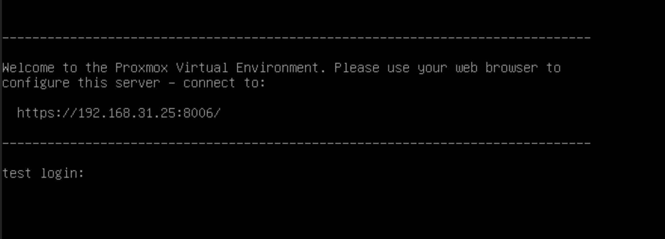 重启后,显示一个命令行,并提示你现在可以通过 web 来登录 PVE 的管理页面了。