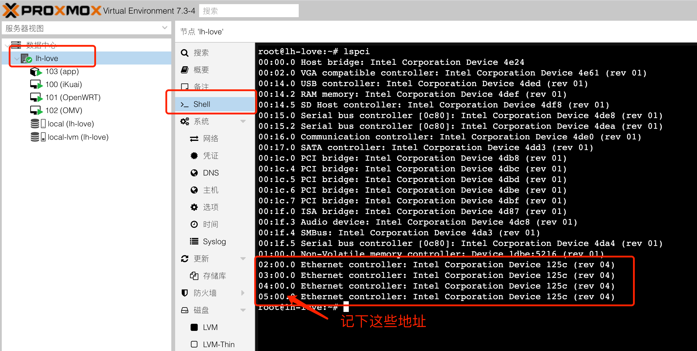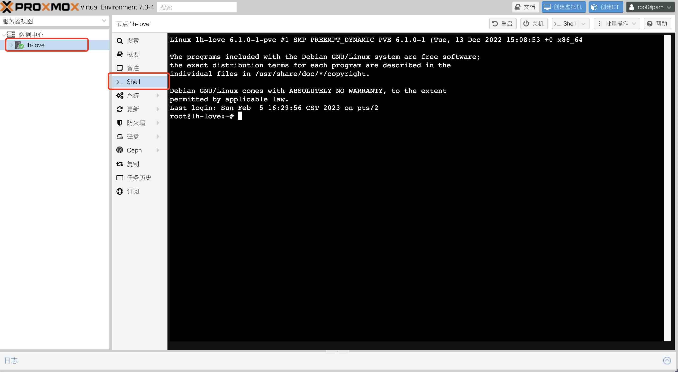 我们需要先进入主机的 shell 界面,你可以直接通过 ssh root@192.168.31.25 来进行链接,也可以在管理页面上直接访问某一个宿主机节点的 shell,如下