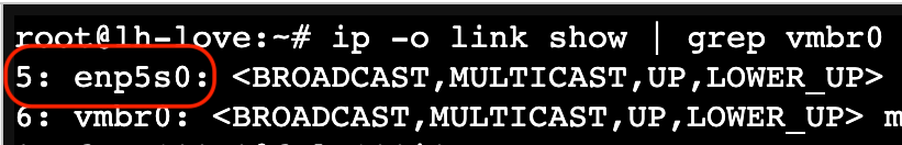我们只能直通另外 3 张网卡,所以我们需要确定现在宿主机使用的网卡是哪一张。继续通过终端输入 ip -o link show | grep vmbr0: