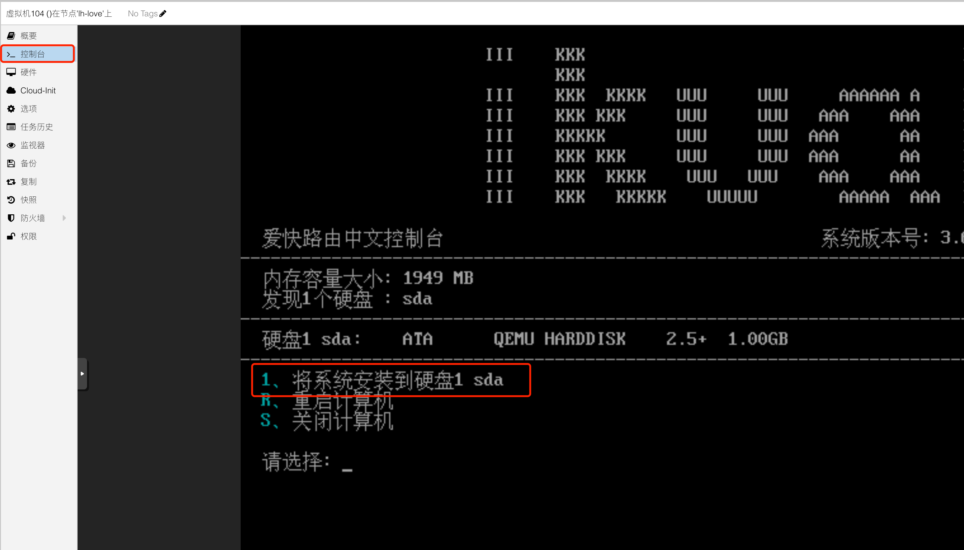 实际上,ikuai 此时并没有安装完成,我们需要将ikuai先安装在刚才分配的 1G 的磁盘中,按照提示输入 1 后回车。
