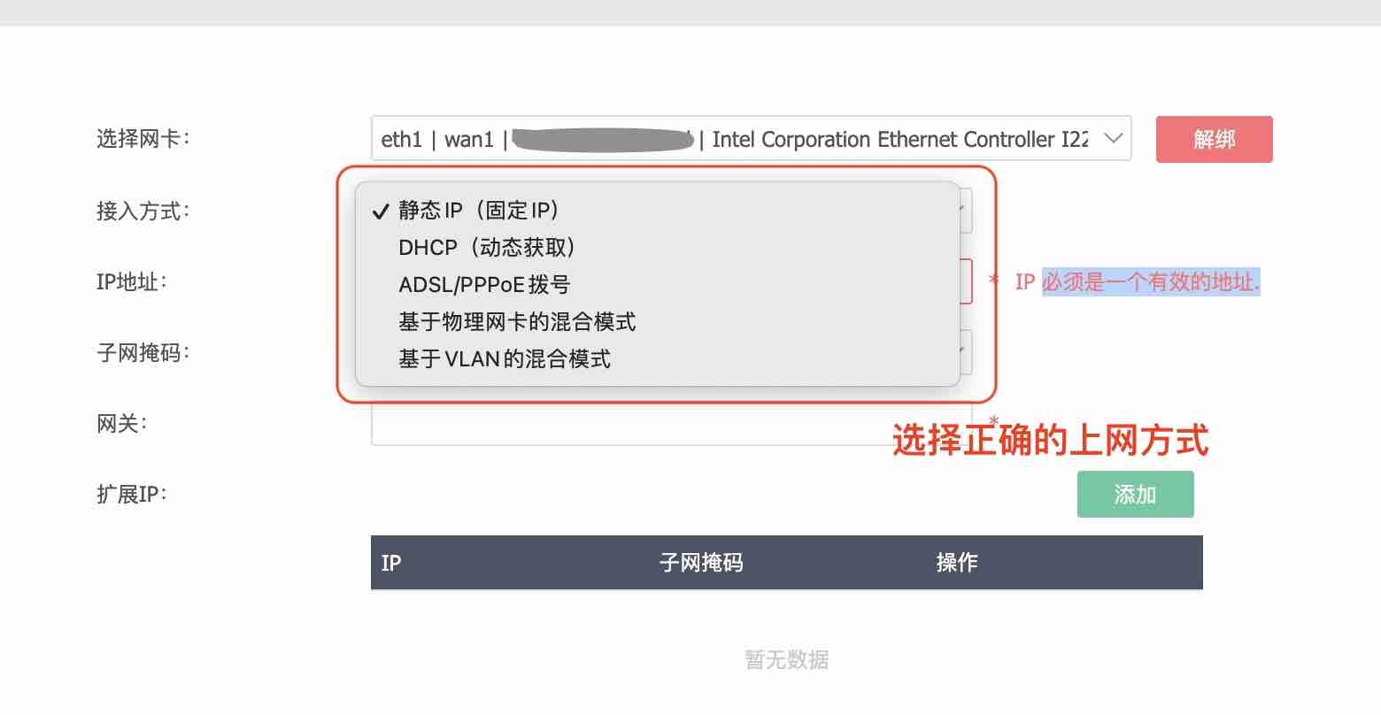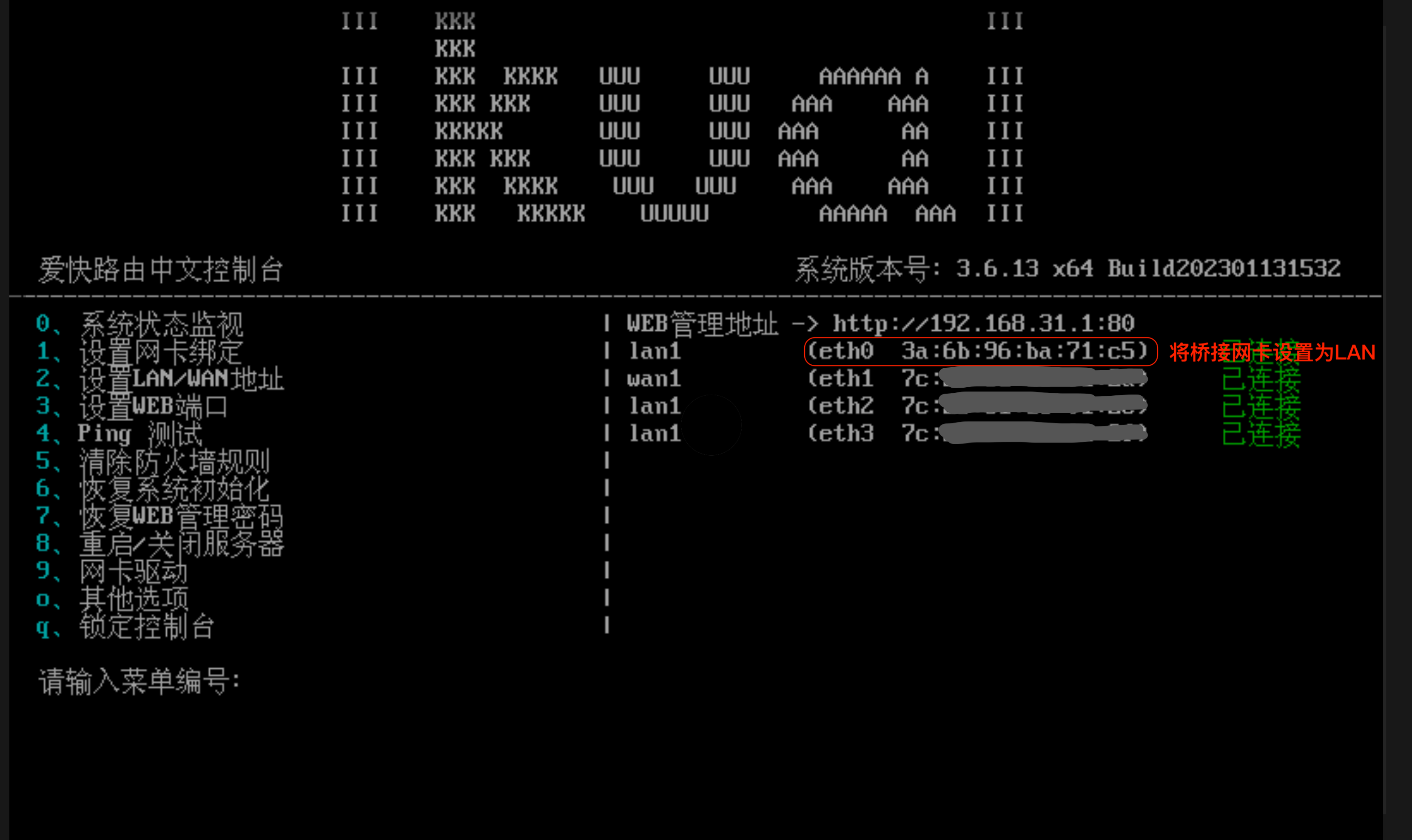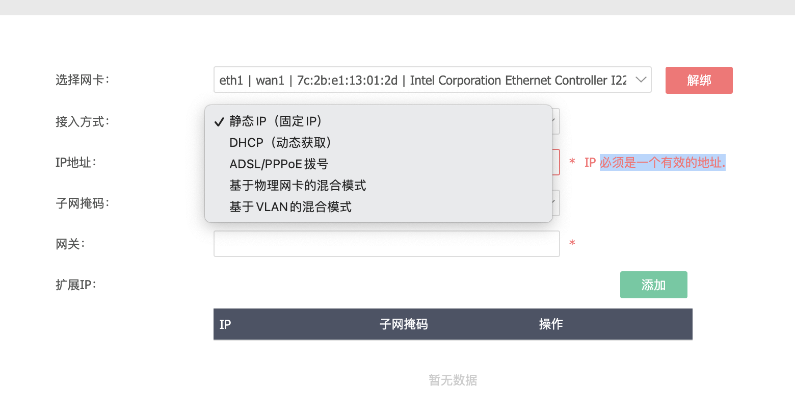 注意,我们应该将 LAN 设置为我们桥接进去的网卡,如果此时 LAN 对应的不是桥接的网卡,必须使用 《1. 设置网卡绑定》来将桥接的网卡指定为 LAN。