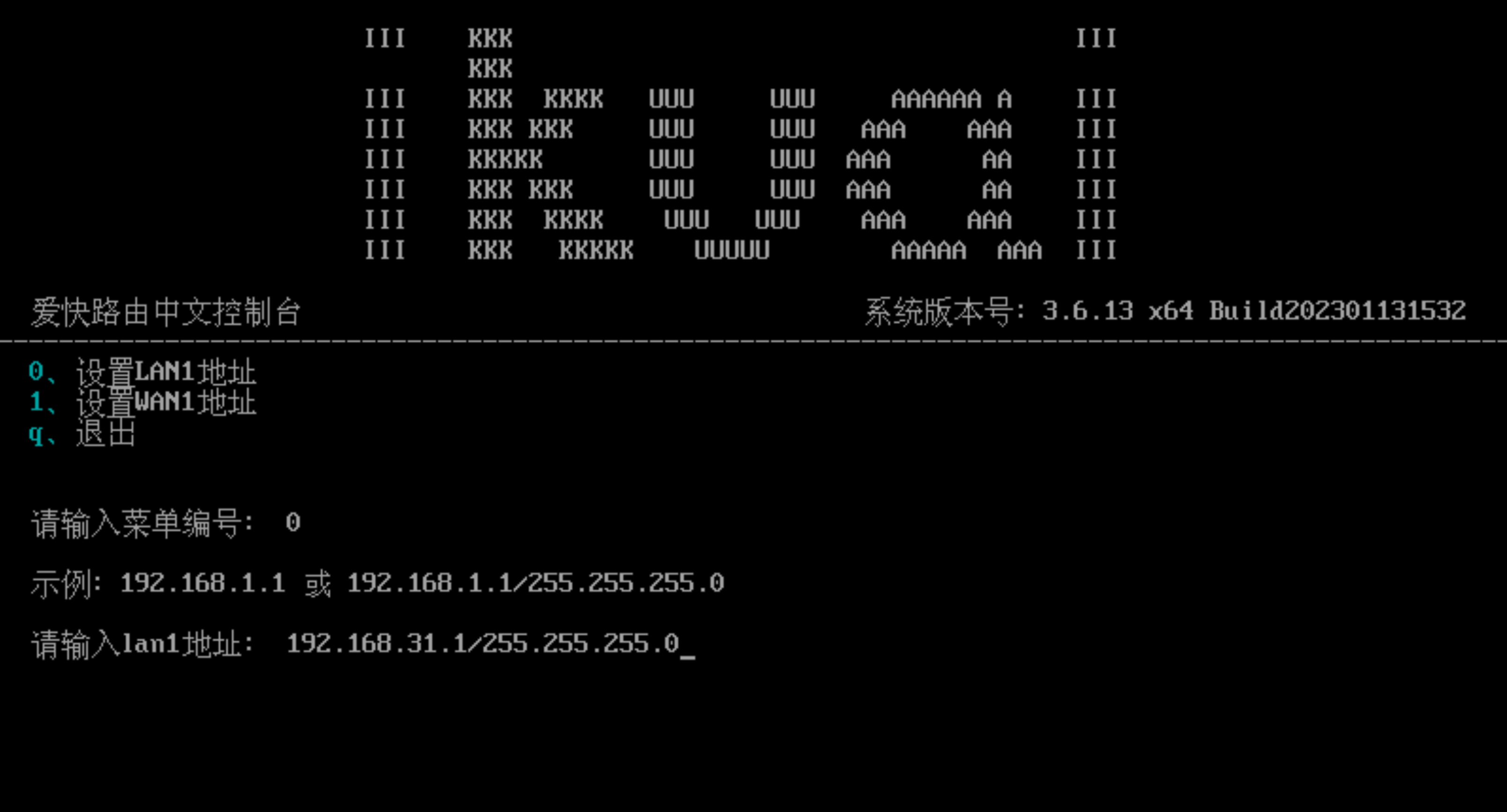 先选择 2,再选 0,输入地址。由于我们刚才都是在 192.168.31.0/24 这个网段的,这里我们也一样要保持这个网段不变,这里可以设置为 192.168.31.1/255.255.255.0,这就是我们局域网内的网关地址了。