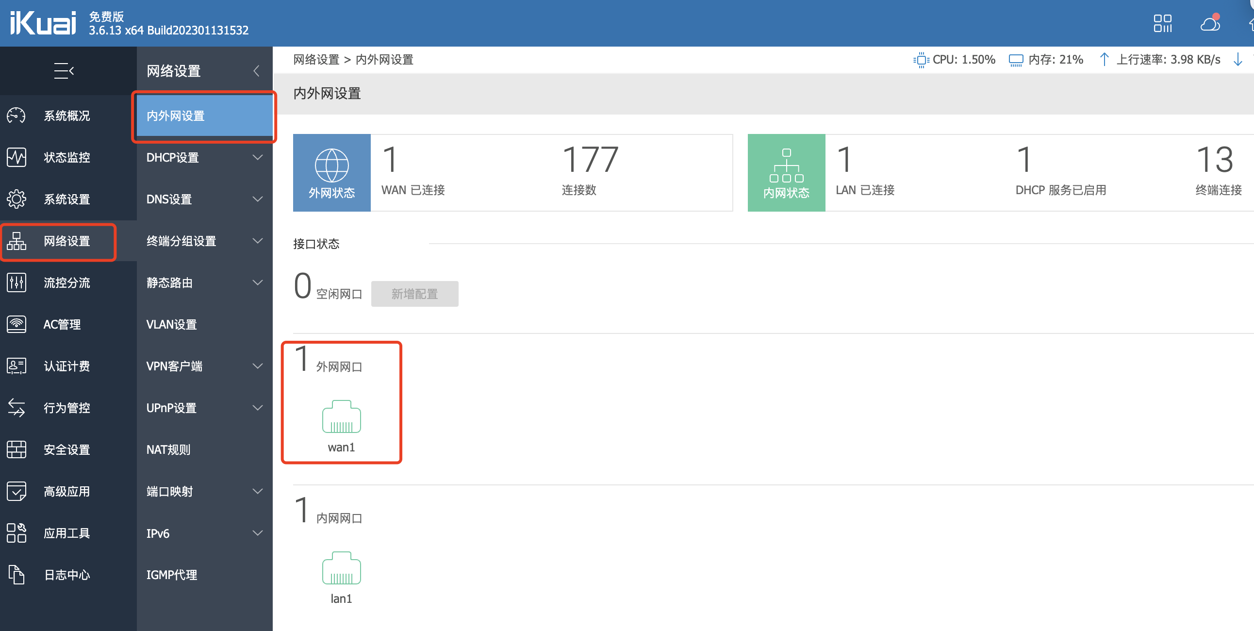 选择 《网络设置》《内外网设置》《wan1》