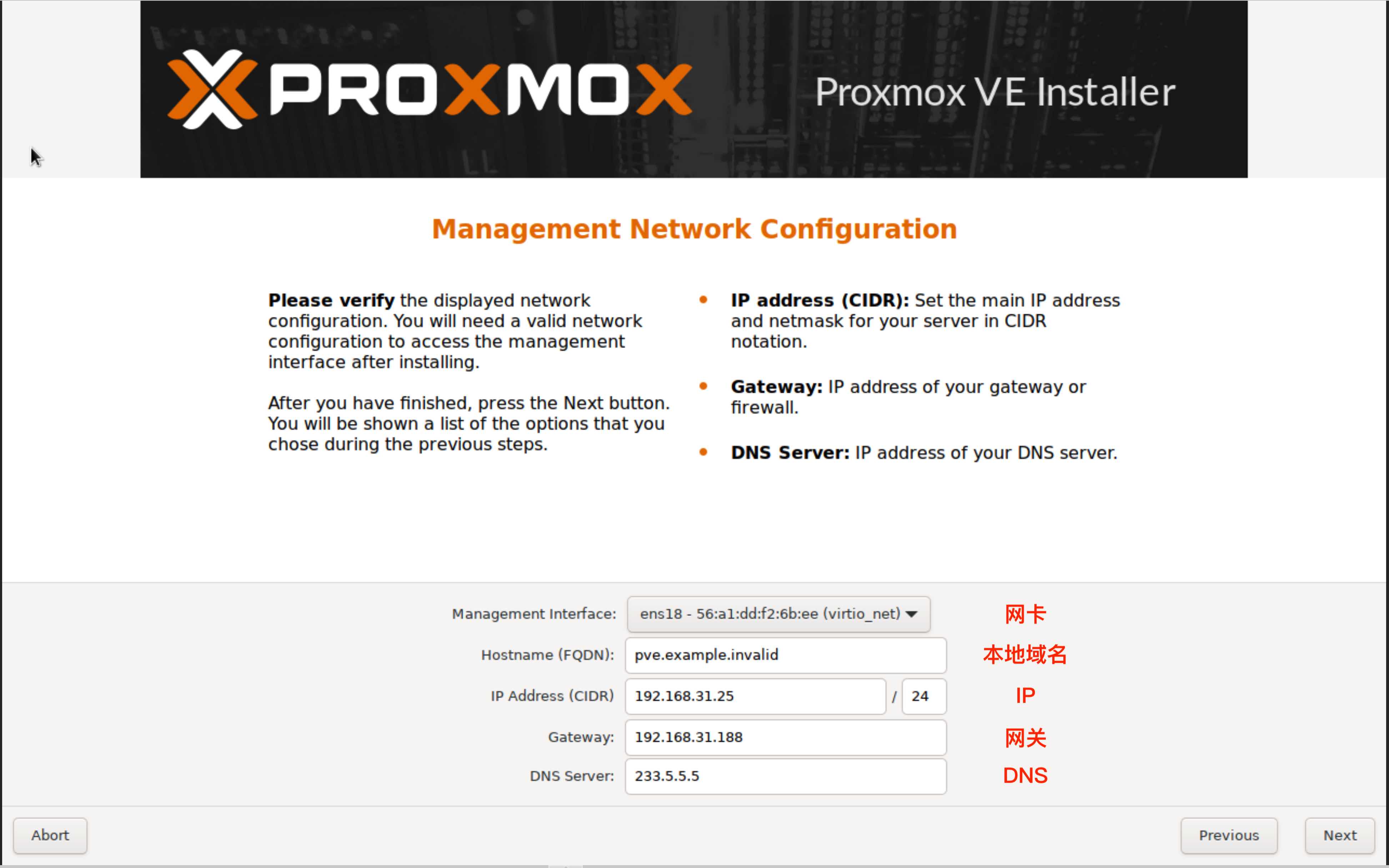 这里是一个下拉框,你的主机有几个网口这里应该就有显示几张网卡。我这里写的是什么ens18,是因为我这是在虚拟机里面安装 PVE 做演示的原因,一般来说应该是 enp2s0 或者 ens0 之类的,并且数字是顺序递增的。