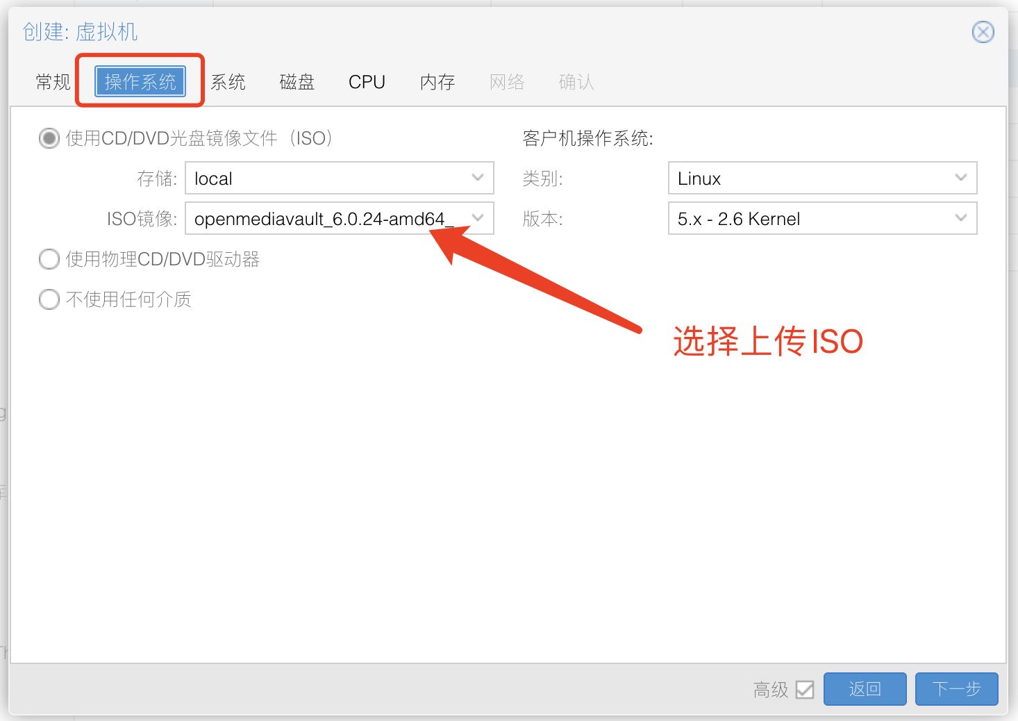 在后续的安装选项中,我们可以在 操作系统 选项卡中找到我们上传的 ISO 镜像