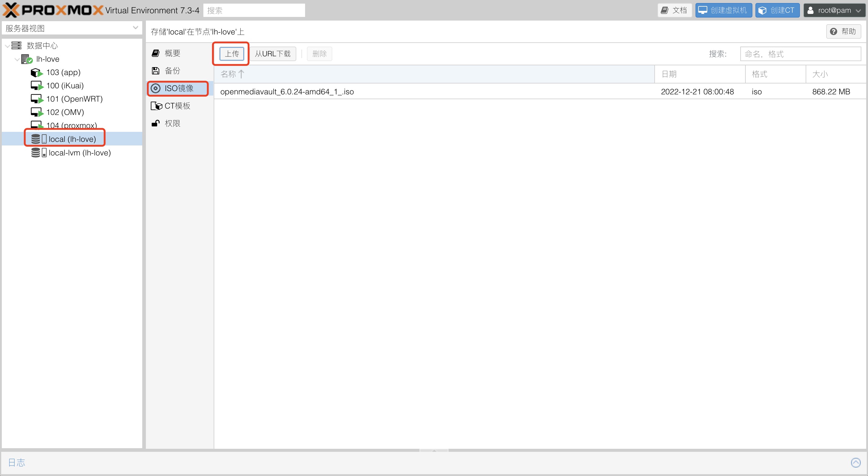 要安装一个虚拟机,我们需要先下载系统的安装文件,然后把他上传到 local 分区中的 ISO 镜像中。