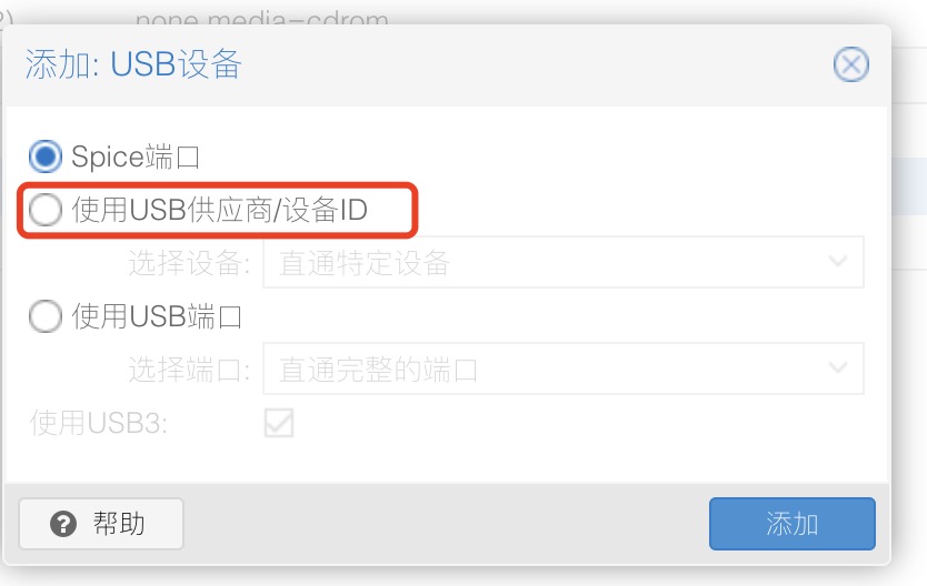 注意选择通过USB供应商/设备ID进行直通