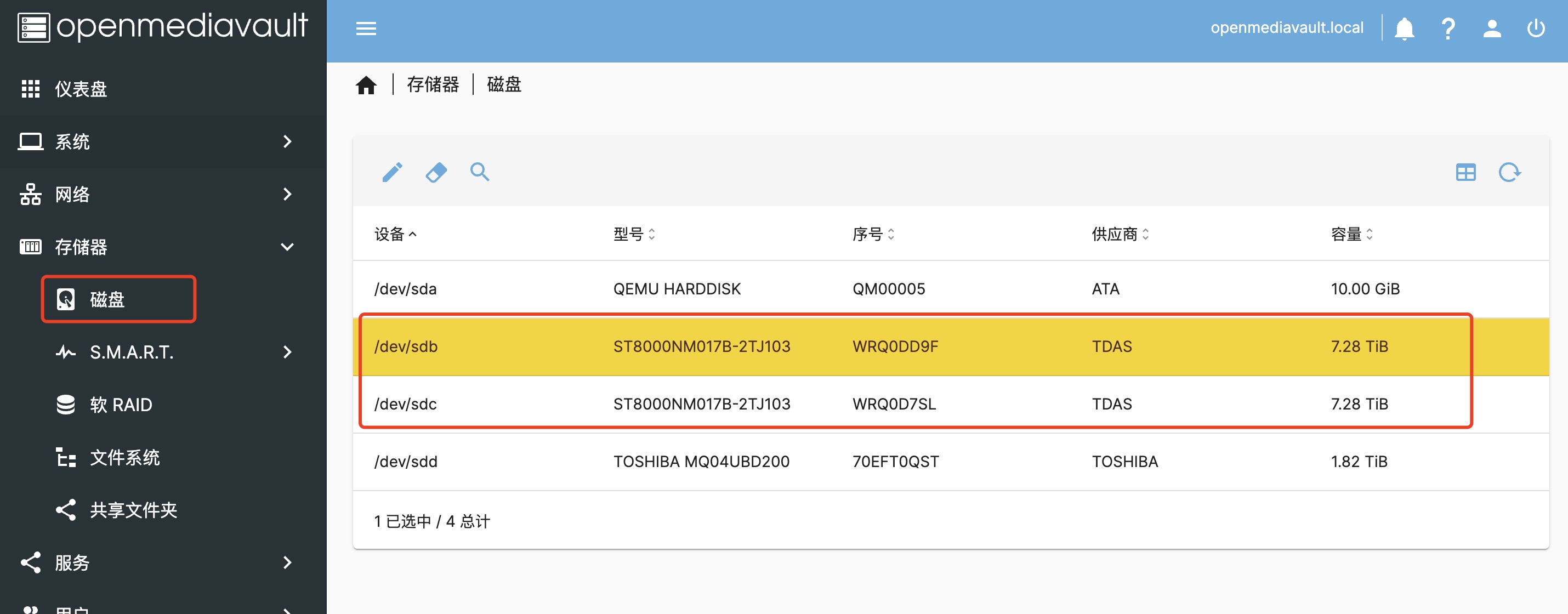 重新启动 OMV 后,可以在磁盘一栏中看到我们挂载的设备