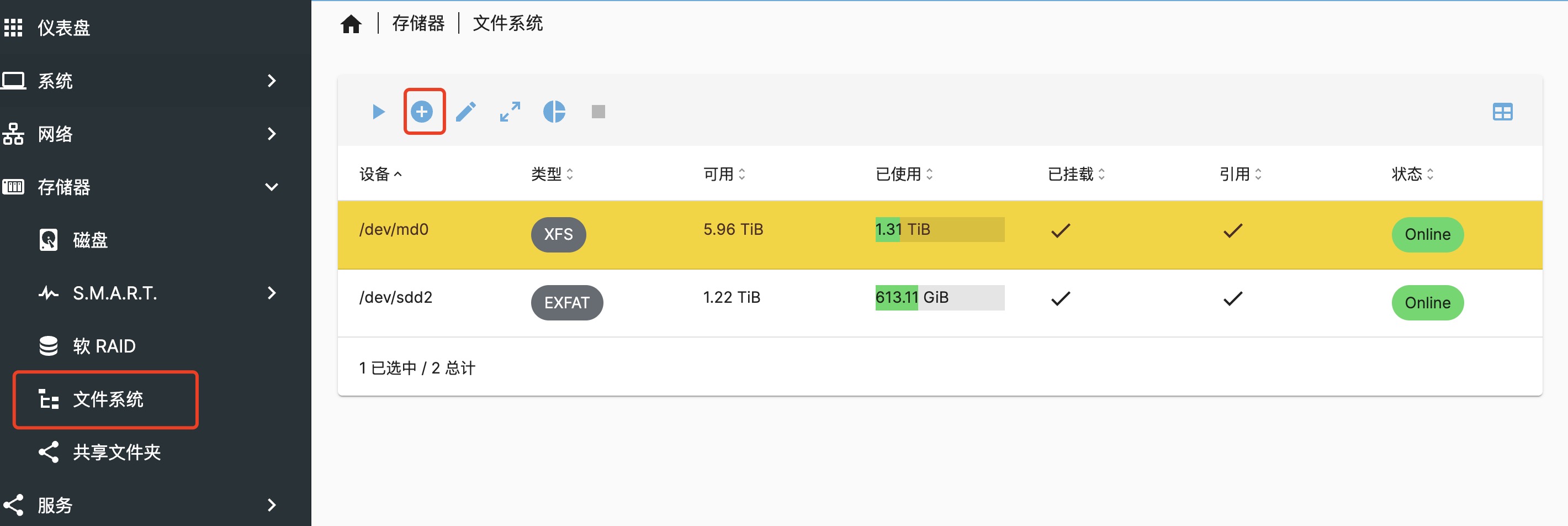 随后,在 OMV 的文件系统菜单中,我们可以将 raid 挂载