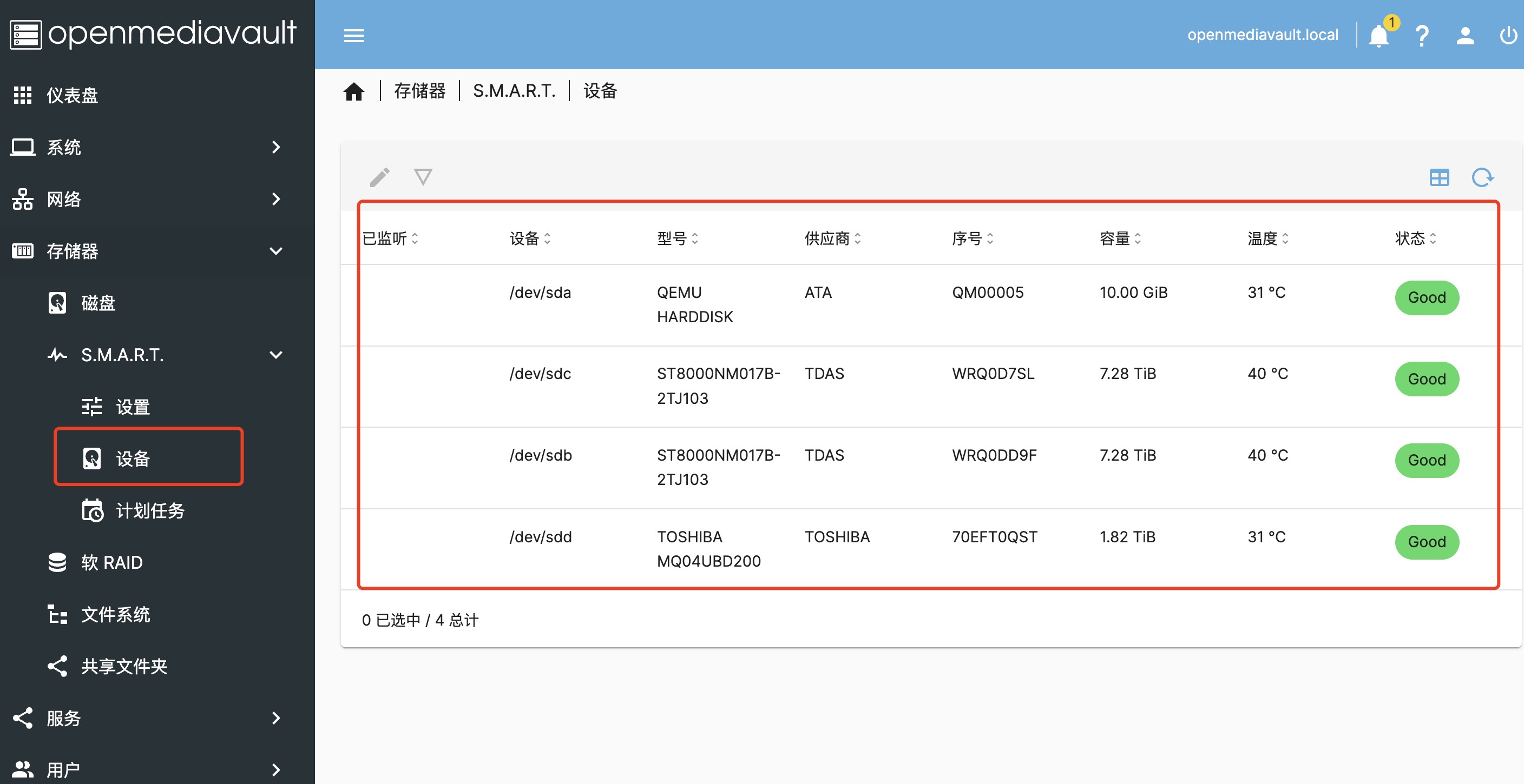 除了对文件进行分享外,OMV 还提供了可视化的 SMART 工具,能够对硬盘的状态进行监控。